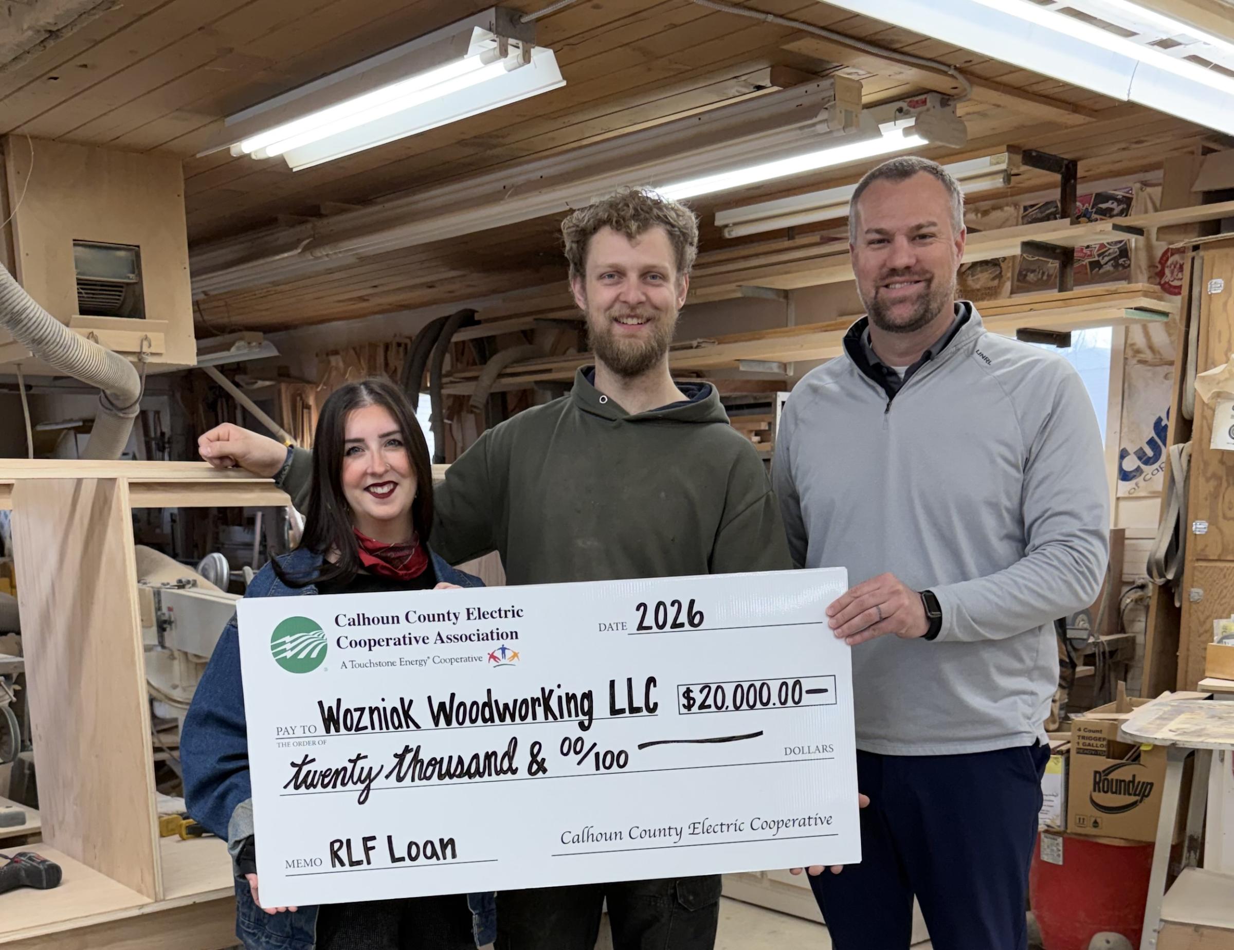 Calhoun County Electric Cooperative is proud to support local business growth through its Revolving Loan Fund (RLF). Recently, CCECA finalized a $20,000 RLF loan with Ben and Maddie Wozniak, owners of Wozniak Woodworking LLC. The funding assisted in the purchase of an existing Rockwell City business formally known as Warner Woodworking.