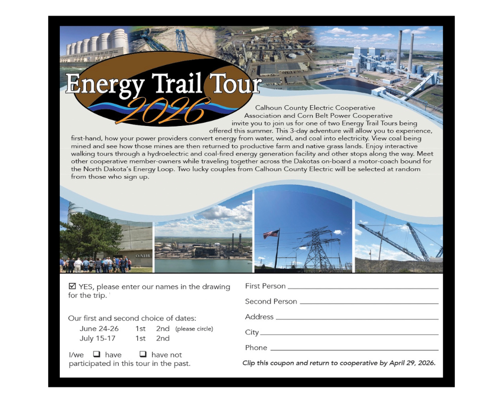 Calhoun County Electric Cooperative and Corn Belt Power Cooperative invite you to consider joining us for an Energy Trail Tour. Tours are provided in early summer and provide a 3-day adventure that will allow you to view, first-hand, how your power providers convert energy from water, wind, and coal into electricity. View coal being mined and see how those mines are, then, returned to productive farm and native grass lands. Learn how the energy industry is evolving to become more dependent on renewable power generation and glimpse into the future of carbon capture technology. Enjoy the fellowship of other cooperative member-owners on a comfortable motor coach journey to North Dakota’s Energy Loop. Two lucky couples from Calhoun County Electric Cooperative will be selected at random from those who sign up, and tour costs will be covered by Corn Belt Power Cooperative and Calhoun County Electric Cooperative.
