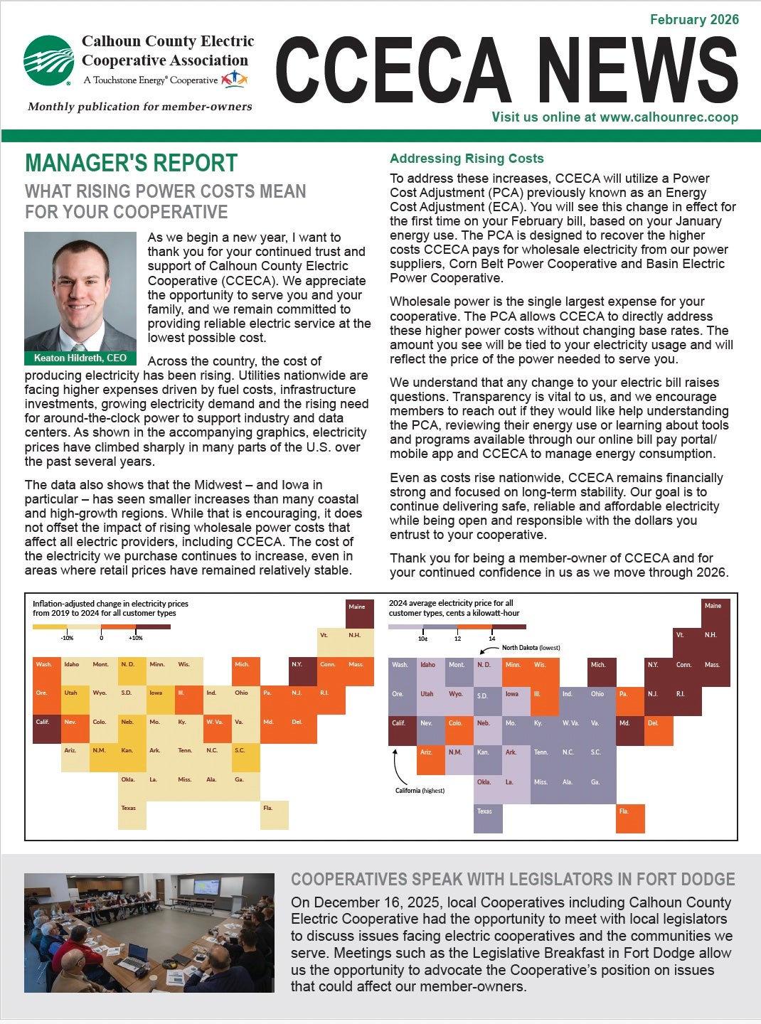 CCECA publishes a monthly newsletter, CCECA News. It contains up-to-date information on distribution line upgrades, energy-efficiency tips, safety information, and updates on legislative items of special interest to our member-consumers. CCECA members also receive a Iowa Electric Cooperative Living Magazine that is included with your membership.