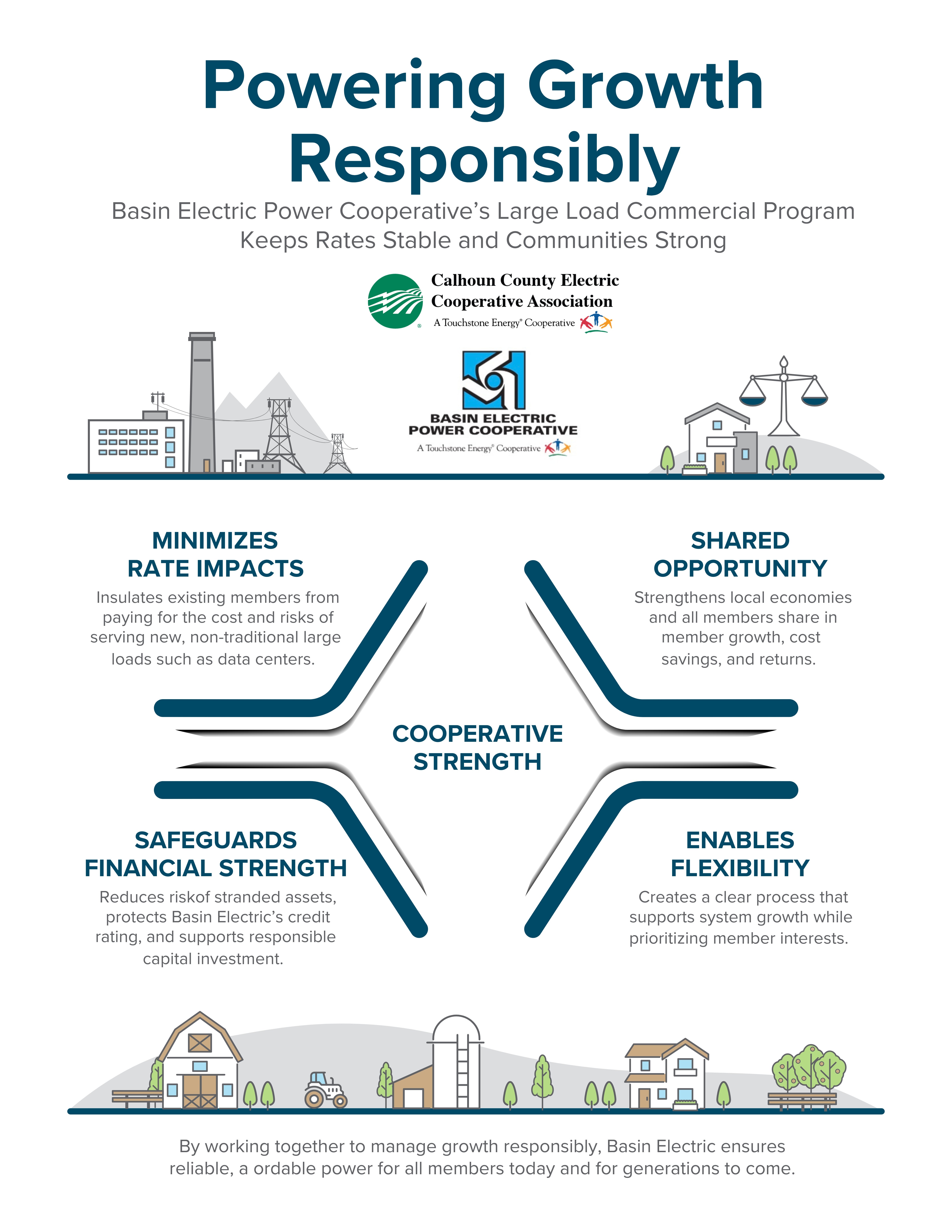 Basin Electric has created a Large Load Program that ensures large facilities such as data centers or manufacturing plants cover the costs of the power and infrastructure they use. This policy helps keep electricity affordable for existing cooperative members while supporting responsible economic growth when it makes sense for the region.
