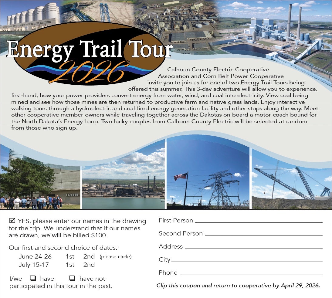 Calhoun County Electric Cooperative and Corn Belt Power Cooperative invite you to consider joining us for an Energy Trail Tour. Tours are provided in early summer and provide a 3-day adventure that will allow you to view, first-hand, how your power providers convert energy from water, wind, and coal into electricity. View coal being mined and see how those mines are, then, returned to productive farm and native grass lands. Learn how the energy industry is evolving to become more dependent on renewable power generation and glimpse into the future of carbon capture technology. Enjoy the fellowship of other cooperative member-owners on a comfortable motor coach journey to North Dakota’s Energy Loop. Two lucky couples from Calhoun County Electric Cooperative will be selected at random from those who sign up, and tour costs will be covered by Corn Belt Power Cooperative and Calhoun County Electric Cooperative.