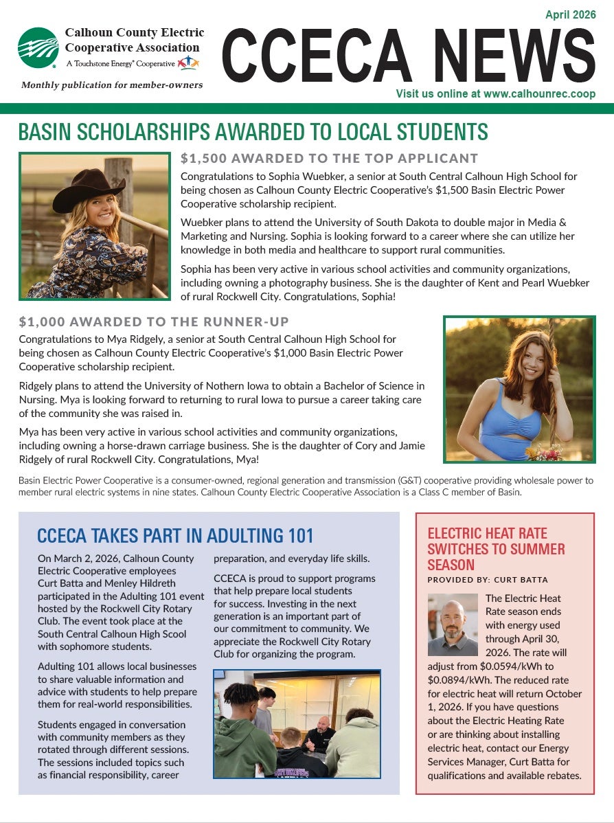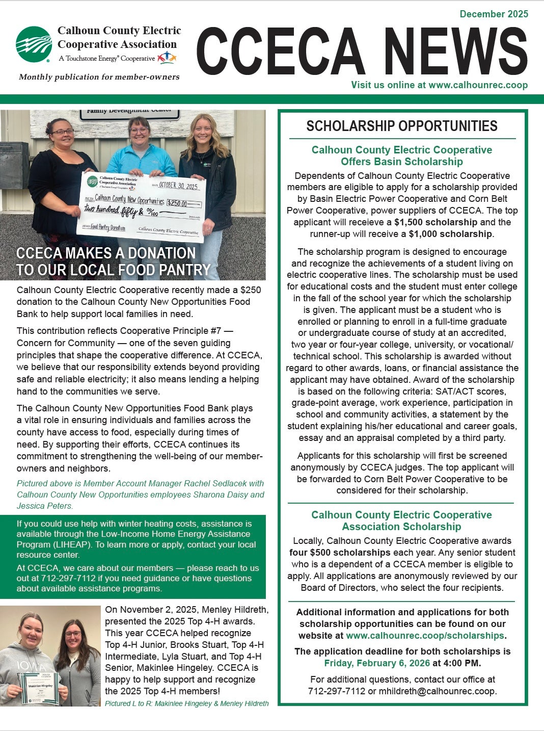 CCECA publishes a monthly newsletter, CCECA News. It contains up-to-date information on distribution line upgrades, energy-efficiency tips, safety information, and updates on legislative items of special interest to our member-consumers. CCECA members also receive a Iowa Electric Cooperative Living Magazine that is included with your membership.